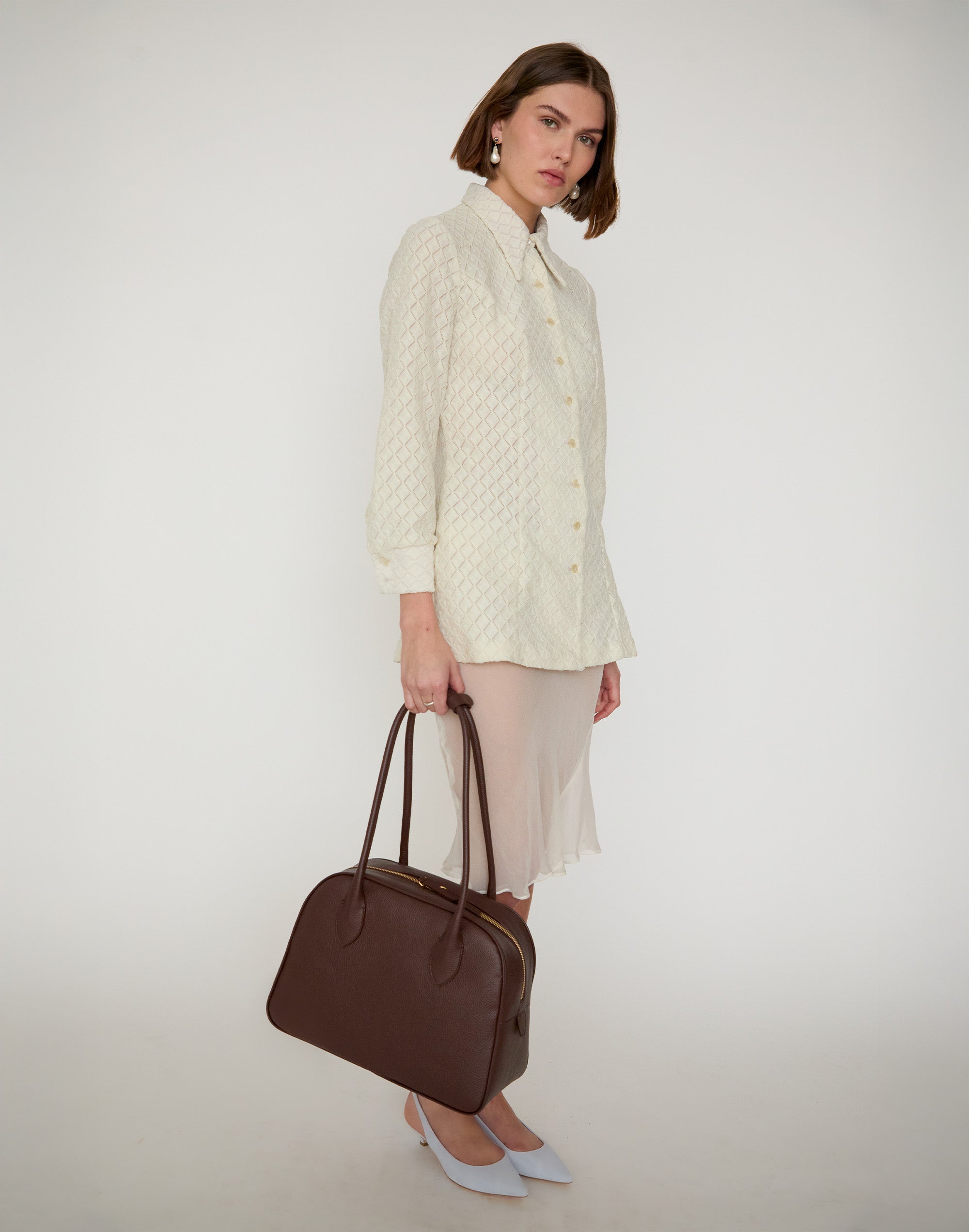 Crafted in Italy from premium upcycled leather, the Autostrada Bowling Tote Bag features a spacious, structured interior that fits everything you need for the day—including a built-in laptop sleeve that comfortably holds up to a 14" laptop. A secure zip pocket keeps your essentials safe, while the wide open interior offers room for notebooks, chargers, water bottles, and more.
