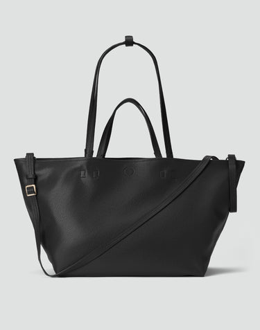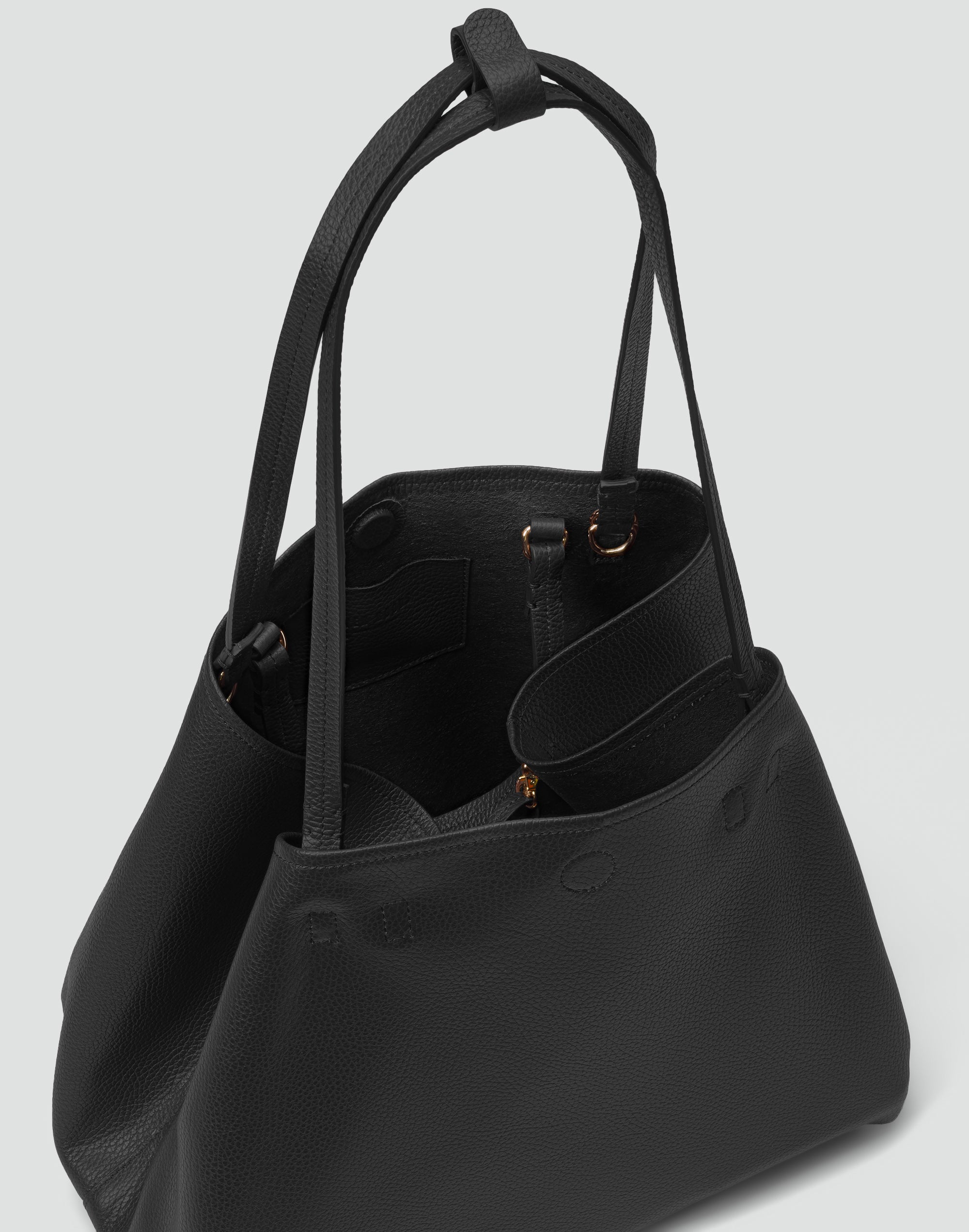 Finished with no logos and no unnecessary details, it’s a black leather tote bag that’s quietly elevated and designed to go everywhere.