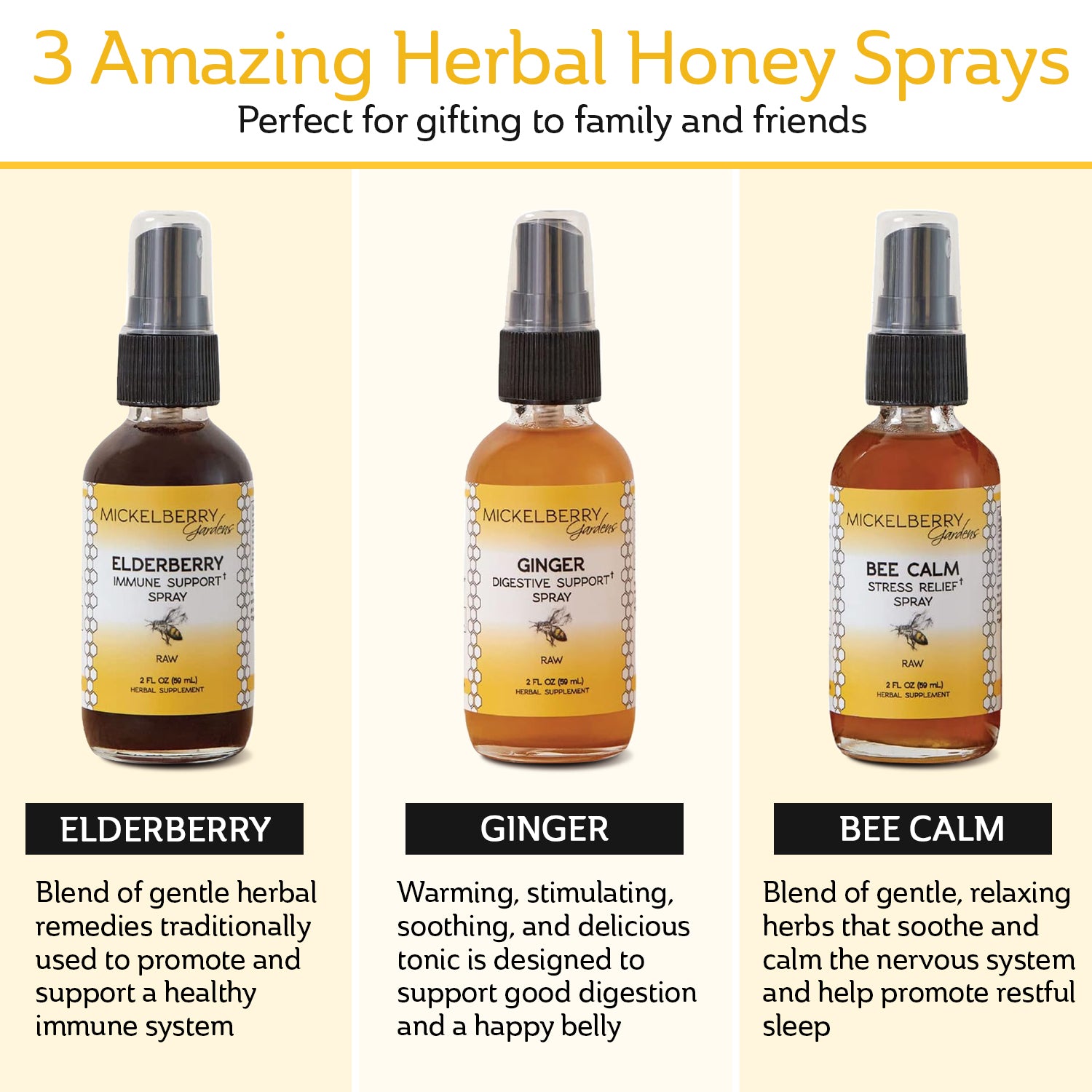Experience the natural wellness of our Herbal Honey Spray Gift Set, featuring three signature sprays made with raw honey, apple cider vinegar, and organic herbs. Bee Calm soothes and promotes restful sleep, Elderberry Immune Support nurtures a healthy immune system, and Ginger Digestive Support comforts and supports digestion. Crafted with the finest regional and local ingredients, each spray combines purity, potency, and delicious flavor, making this a thoughtful and elevated gift for family and friends.