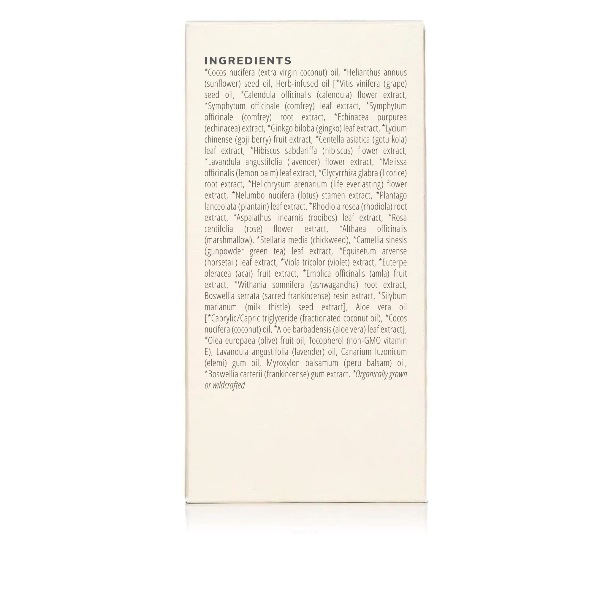 Ingredients: *Cocos nucifera (extra virgin coconut) oil, *Helianthus annuus (sunflower) seed oil, Herb-infused oil [*Vitis vinifera (grape) seed oil, *Calendula officinalis (calendula) flower extract, *Symphytum officinale (comfrey) leaf extract, *Symphytum officinale (comfrey) root extract, *Echinacea purpurea (echinacea) extract, *Ginkgo biloba (gingko) leaf extract, *Lycium chinense (goji berry) fruit extract, *Centella asiatica (gotu kola) leaf extract, *Hibiscus sabdariffa (hibiscus) flower extract, *Lavandula angustifolia (lavender) flower extract, *Melissa officinalis (lemon balm) leaf extract, *Glycyrrhiza glabra (licorice) root extract, *Helichrysum arenarium (life everlasting) flower extract, *Nelumbo nucifera (lotus) stamen extract, *Plantago lanceolata (plantain) leaf extract, *Rhodiola rosea (rhodiola) root extract, *Aspalathus linearnis (rooibos) leaf extract, *Rosa centifolia (rose) flower extract, *Althaea officinalis (marshmallow), *Stellaria media (chickweed), *Camellia sinesis (gunpowder green tea) leaf extract, *Equisetum arvense (horsetail) leaf extract, *Viola tricolor (violet) extract, *Euterpe oleracea (acai) fruit extract, *Emblica officinalis (amla) fruit extract, *Withania somnifera (ashwagandha) root extract, Boswellia serrata (sacred frankincense) resin extract, *Silybum marianum (milk thistle) seed extract], Aloe vera oil [*Caprylic/Capric triglyceride (fractionated coconut oil), *Cocos nucifera (coconut) oil, *Aloe barbadensis (aloe vera) leaf extract], *Olea europaea (olive) fruit oil, Tocopherol (non-GMO vitamin E), Lavandula angustifolia (lavender) oil, Canarium commune (elemi) oil, Myroxylon balsamum (peru balsam) oil, *Boswellia carterii (frankincense) gum extract.*Organically grown or wildcrafted