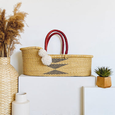 Rooted in timeless craftsmanship, our Larksong African Moses Basket brings natural elegance and modern warmth to your nursery. Handwoven by skilled artisans in Ghana from ethically sourced elephant grass, with vegan leather hand dyed from native plants, each basket is unique in size and color, celebrating heritage and care. Paired with a playful pom pom set, it creates a cozy, stylish, and intentional space for your little one.
