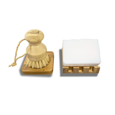 Eliminate plastic from your kitchen and simplify your dishwashing routine with this customizable eco-friendly kit. Each piece is thoughtfully crafted to perform beautifully and return gently to the Earth at the end of its life. Choose your soap block size: Regular with a 6oz Fragrance-Free block or Compact with a 4.4oz Fragrance-Free or Citrus-Scent option. Then, select your scrub level, Regular or Heavy Duty, for your Modular Palm Pot Scrub Brush. Every set includes an Angled Soap Block Dish and a Small Square Soap Dish for your scrub brush, creating a naturally refined and sustainable sink setup.