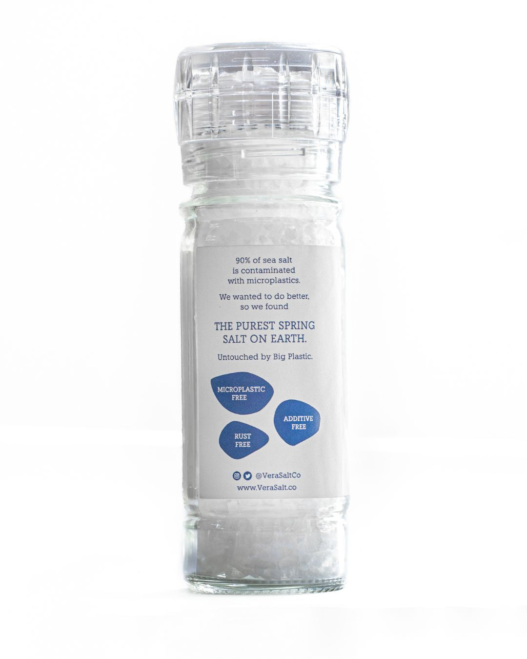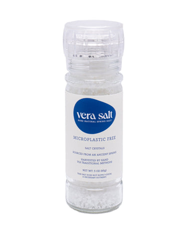 Vera Salt's Spring Salt Grinder is filled with our high-purity white salt crystals, perfect for both general cooking and seasoning. It serves as a wonderful tableside accompaniment for everyday use.