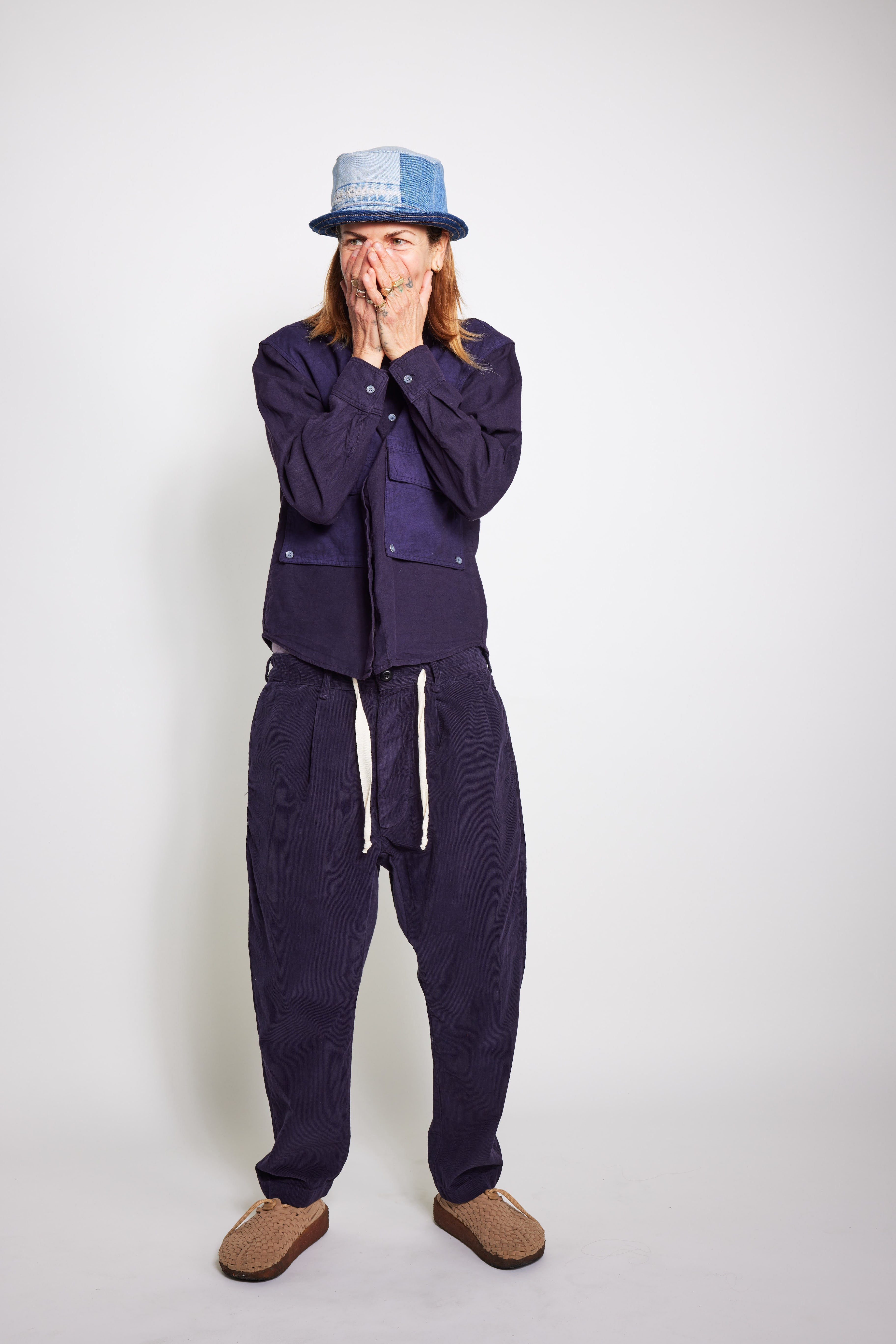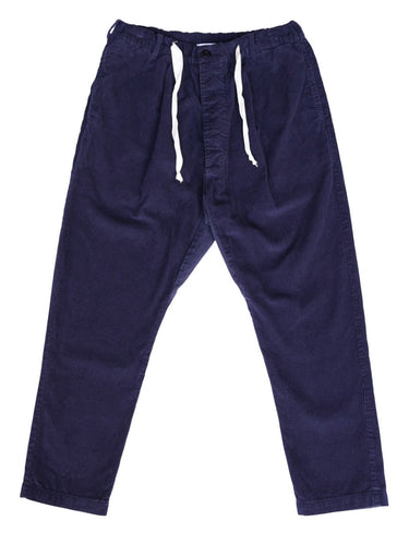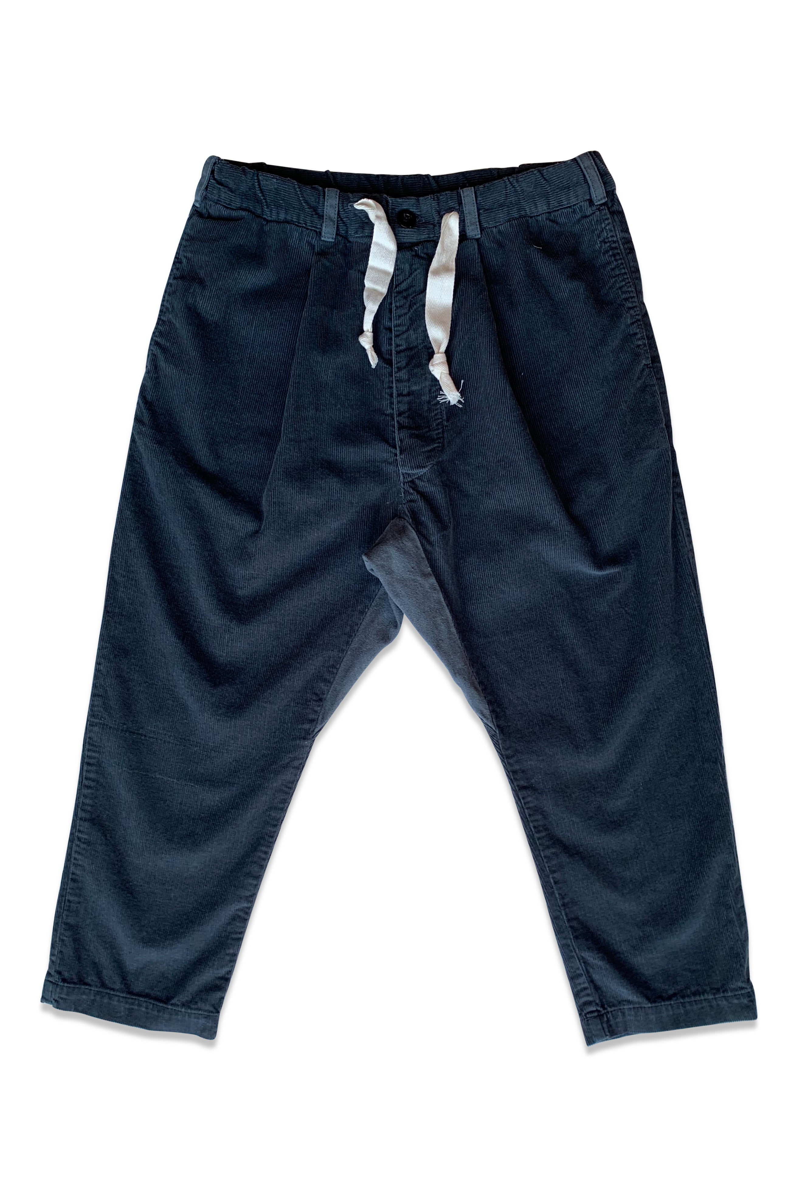 Relaxed cotton corduroy pant with hemp canvas contrast detail.