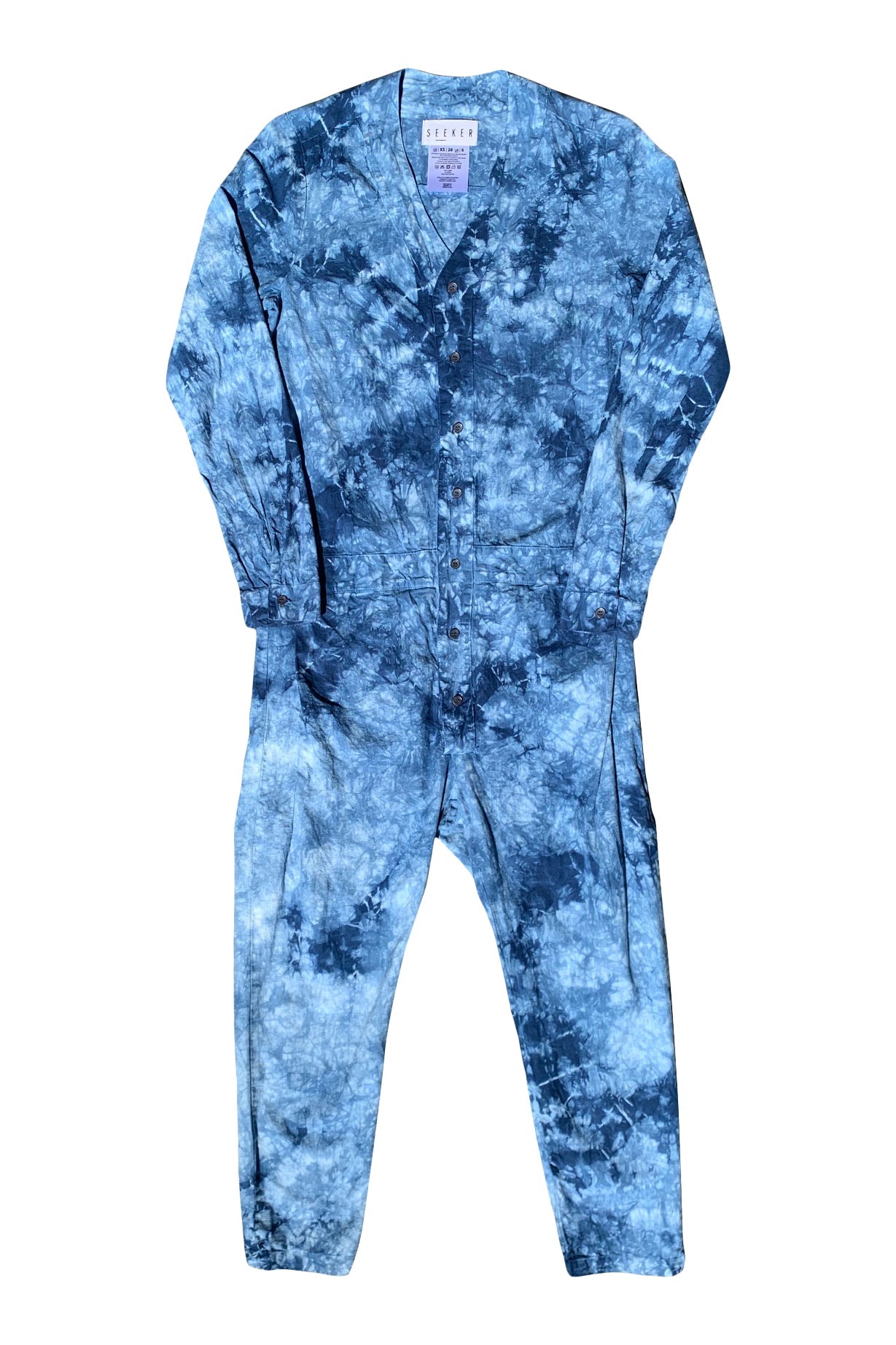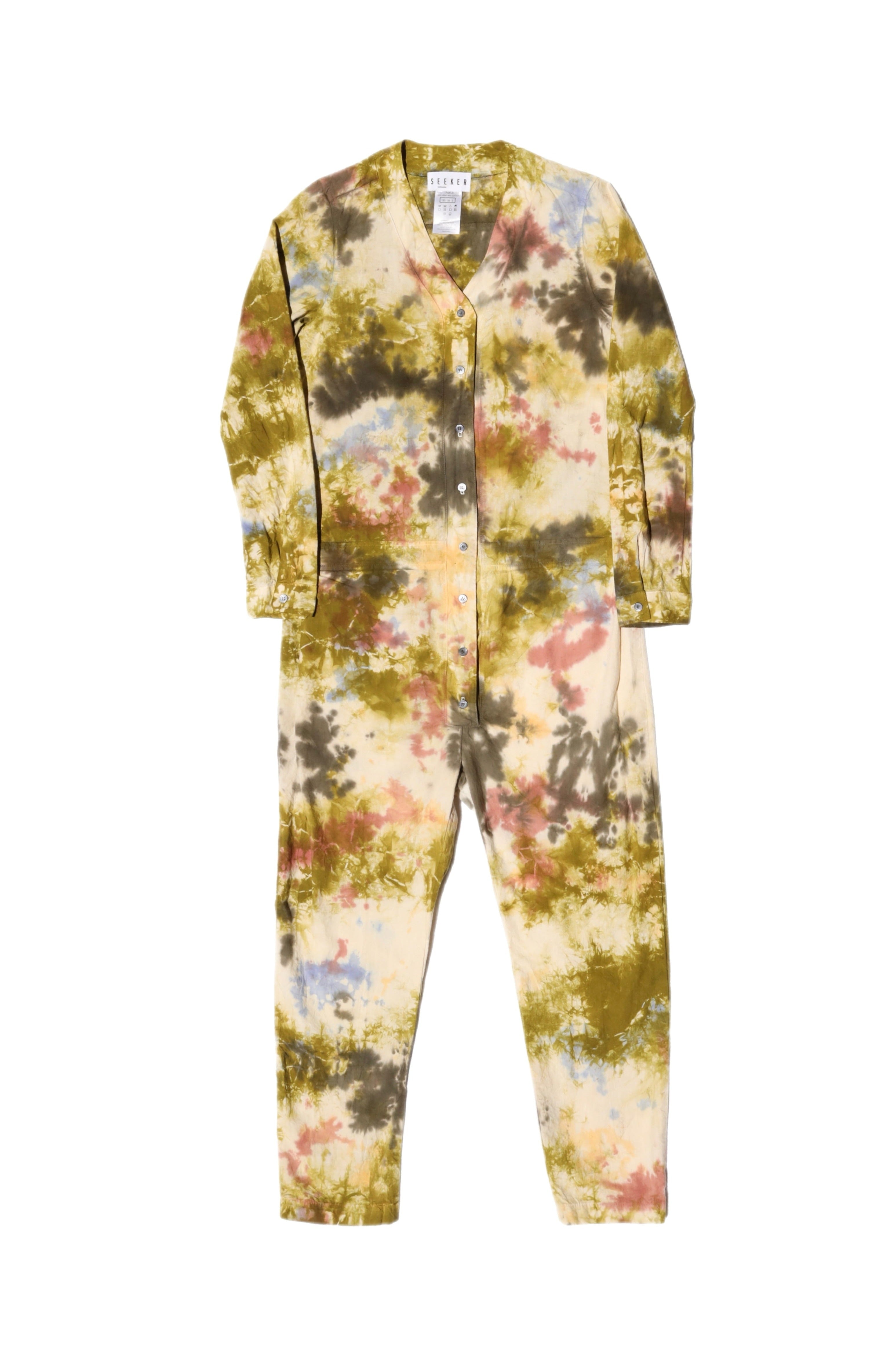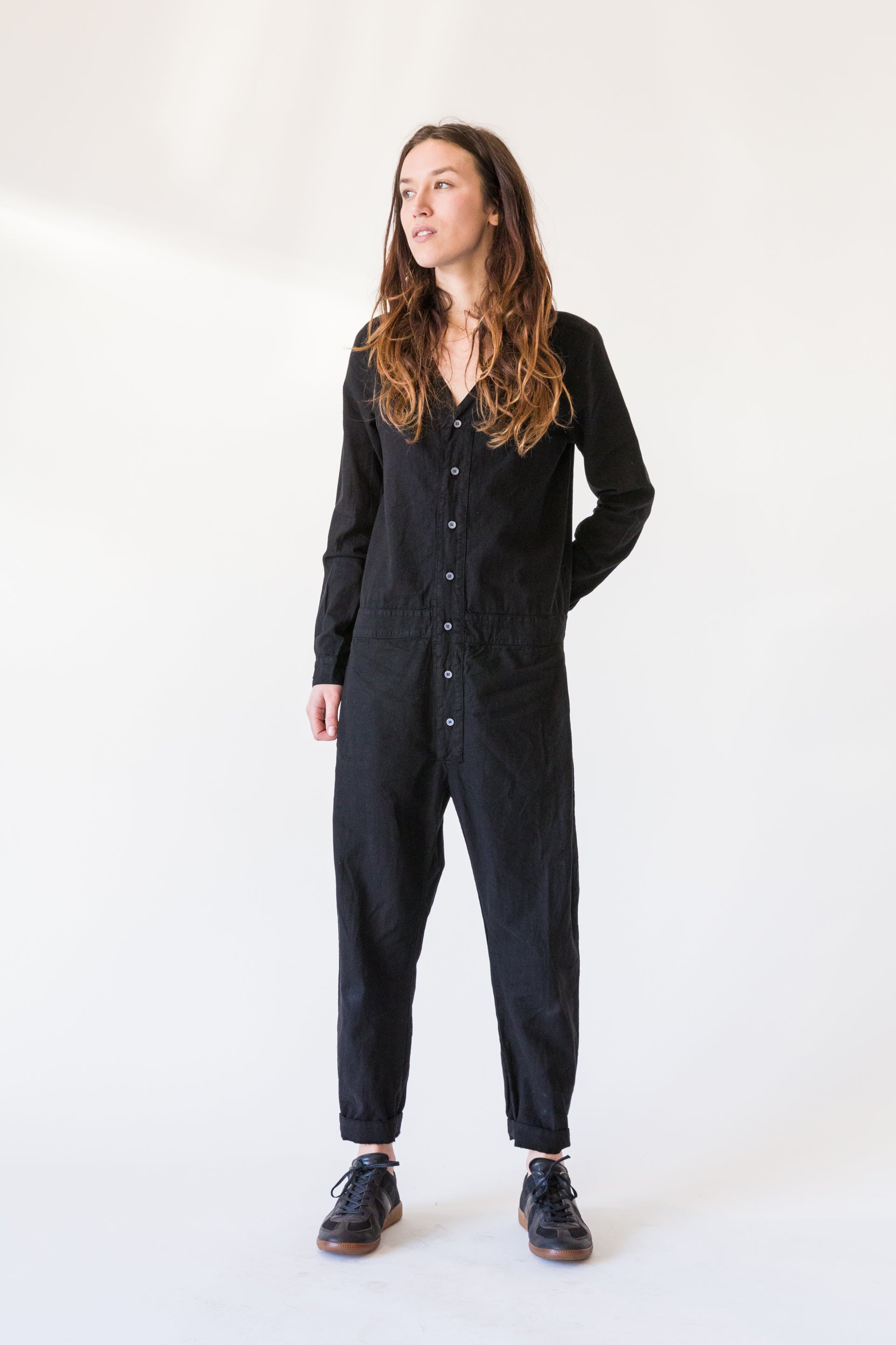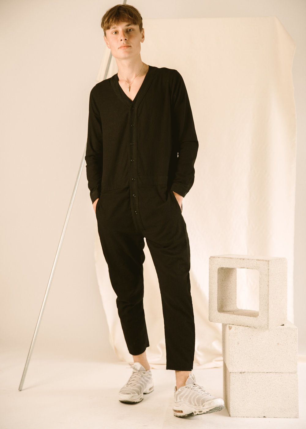 Unisex soft natural hemp-cotton woven jumpsuit.