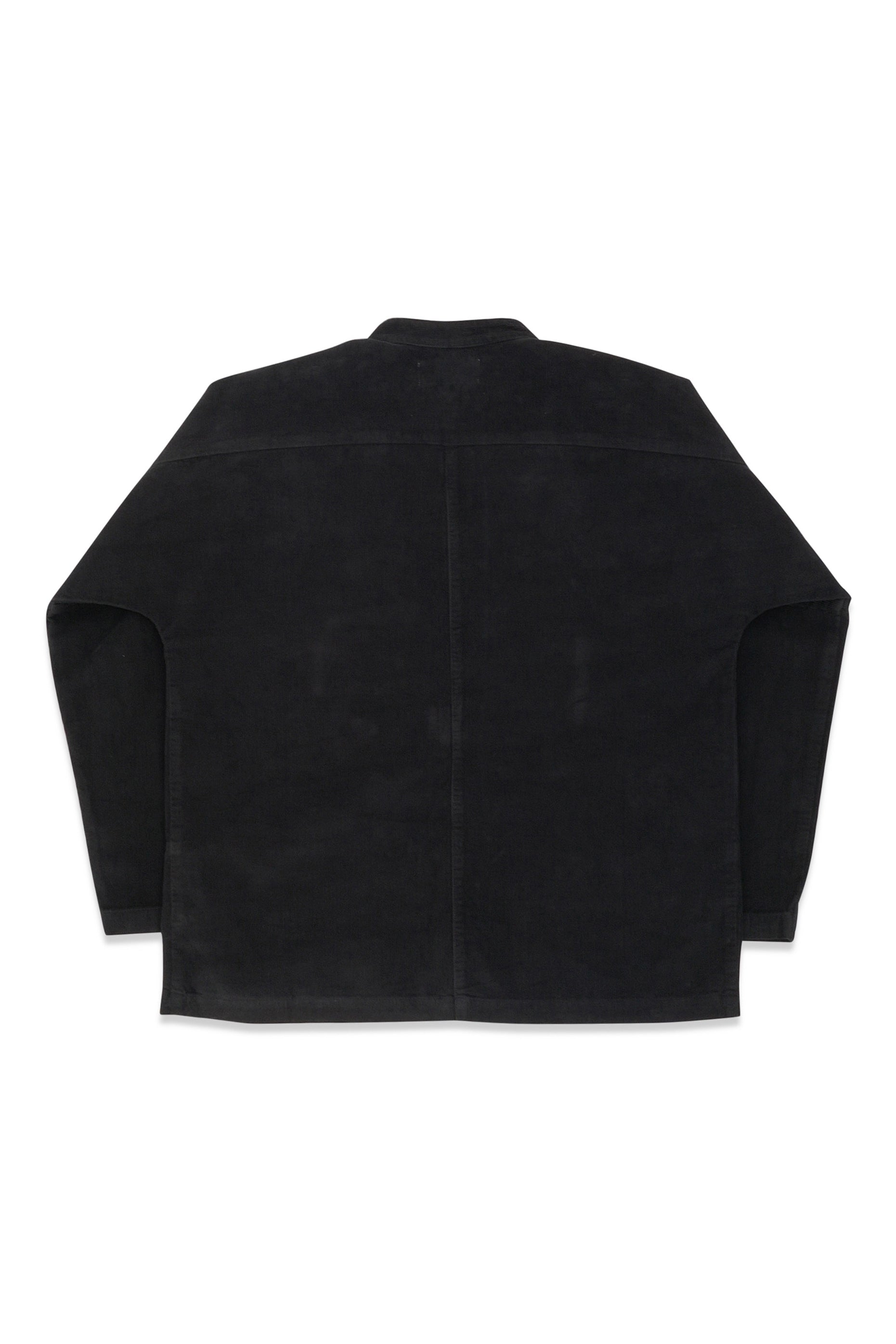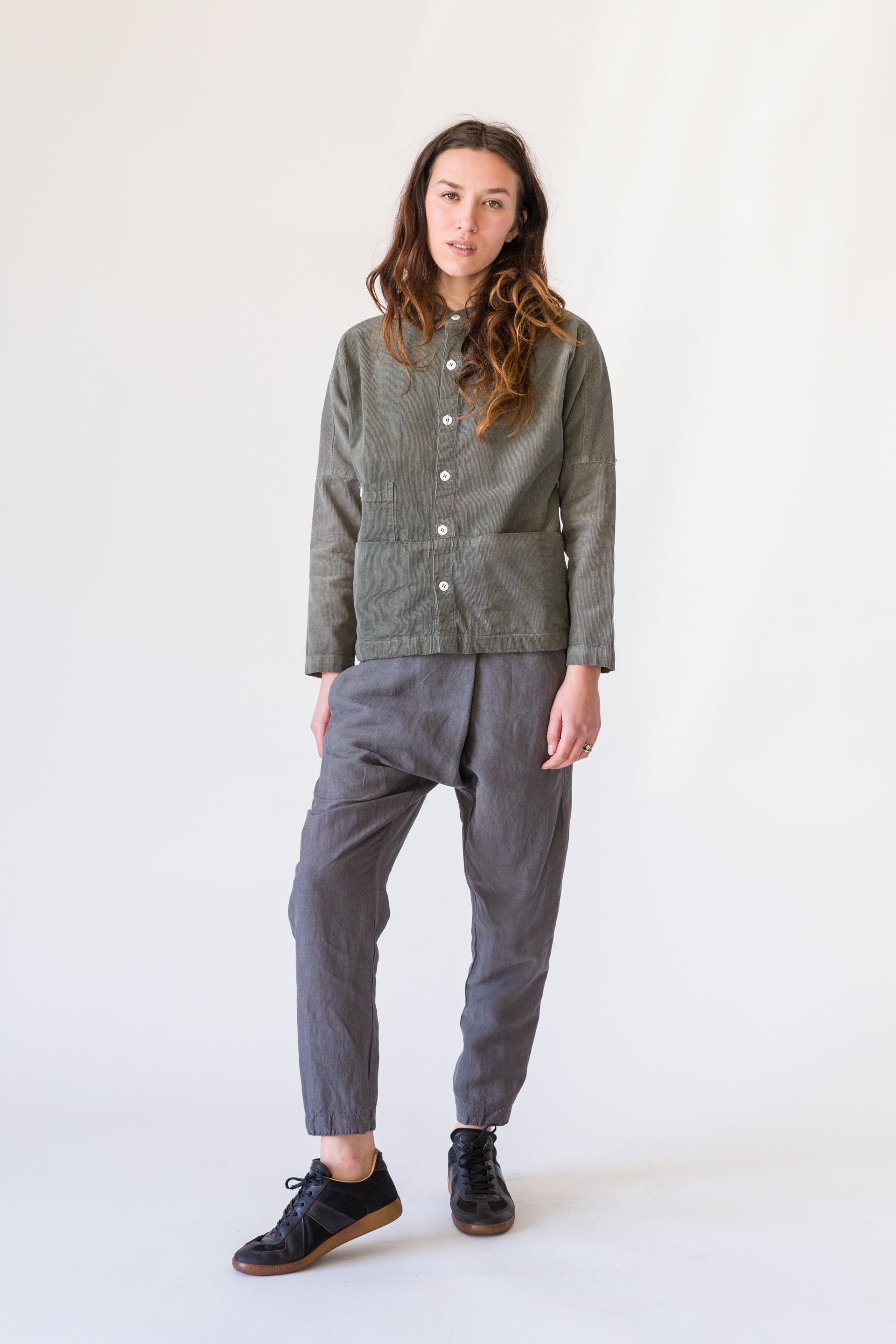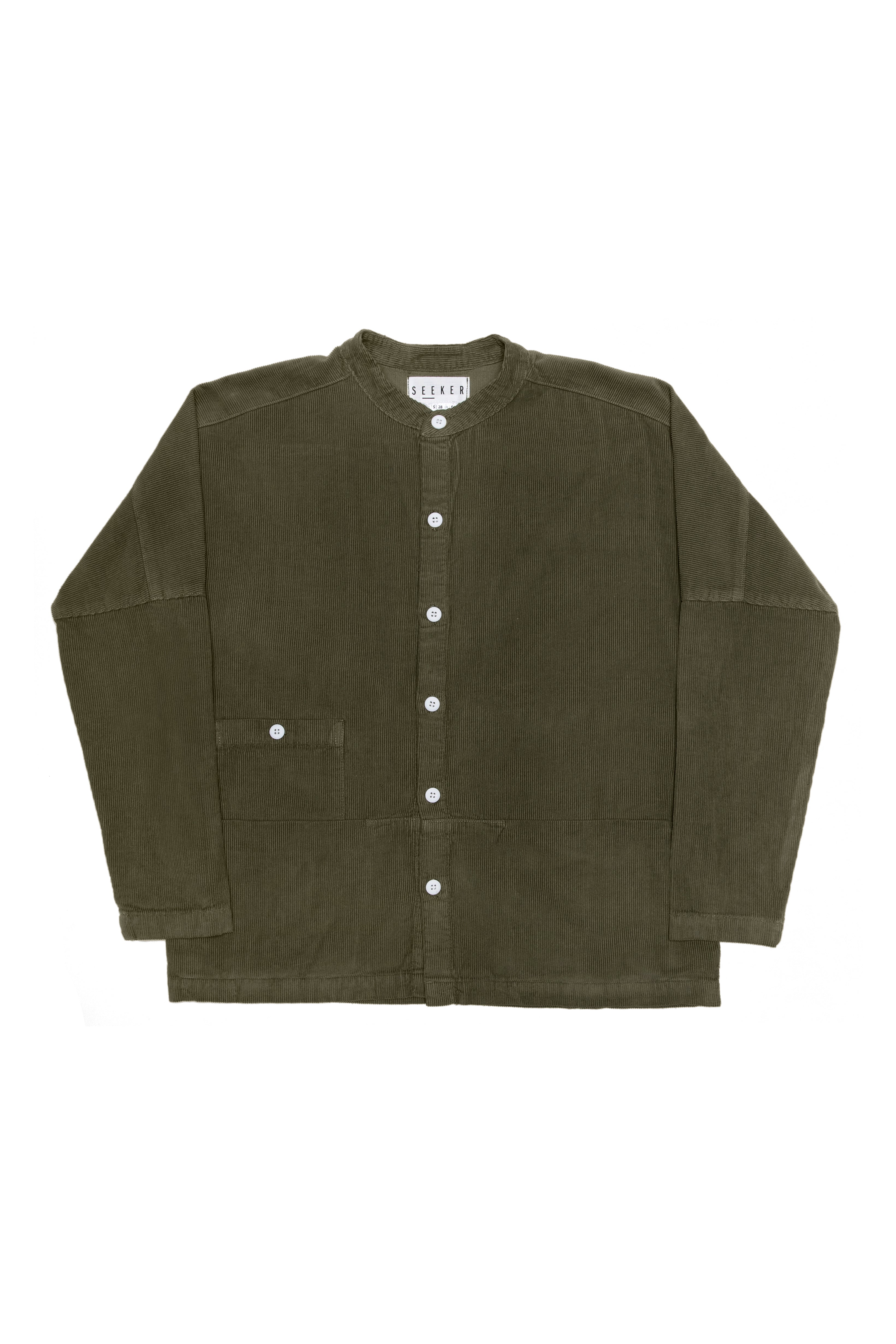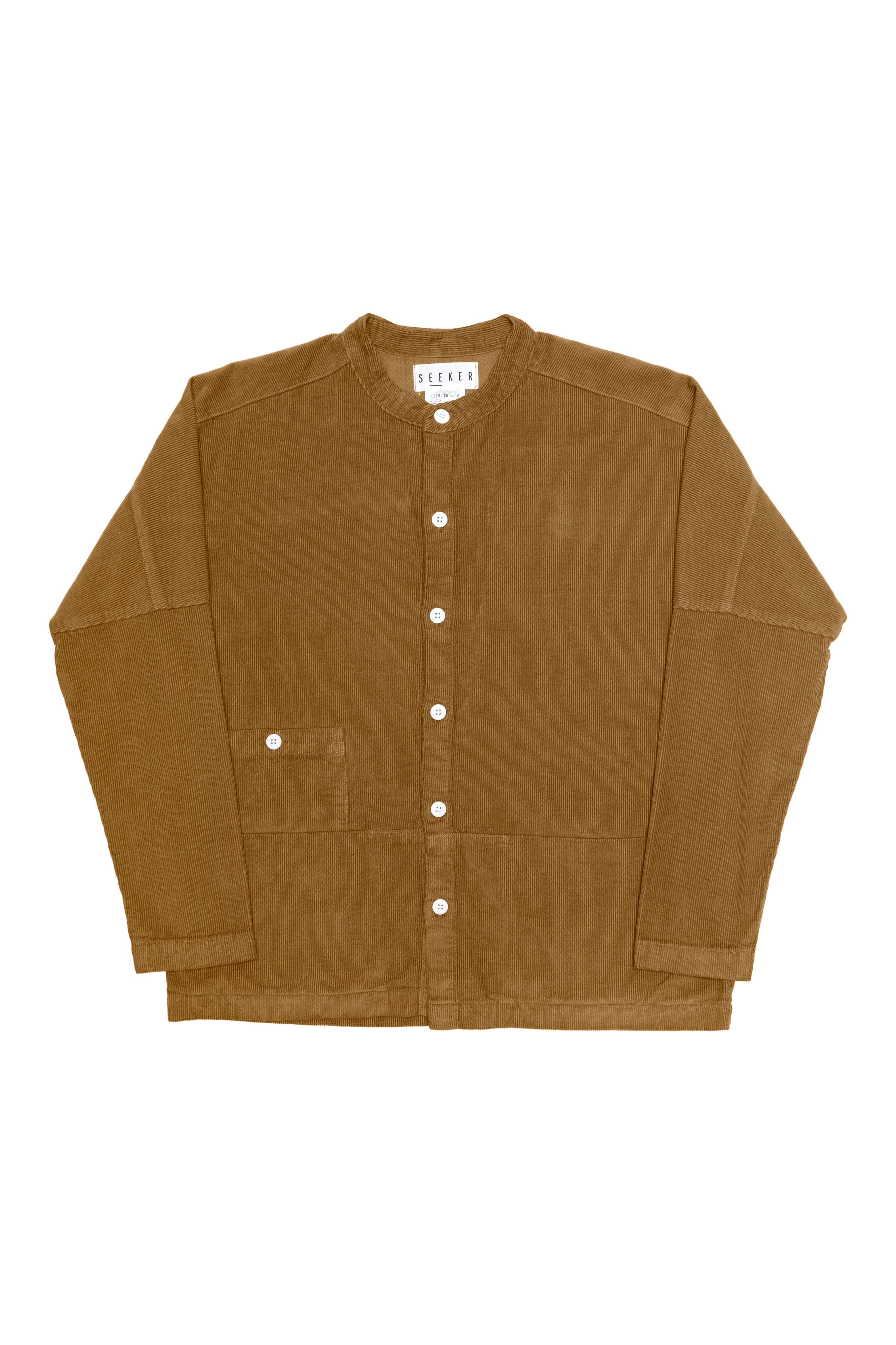 Unisex Natural cotton corduroy Chore coat with a dolman shoulder, mandarin collar, and waist pockets.