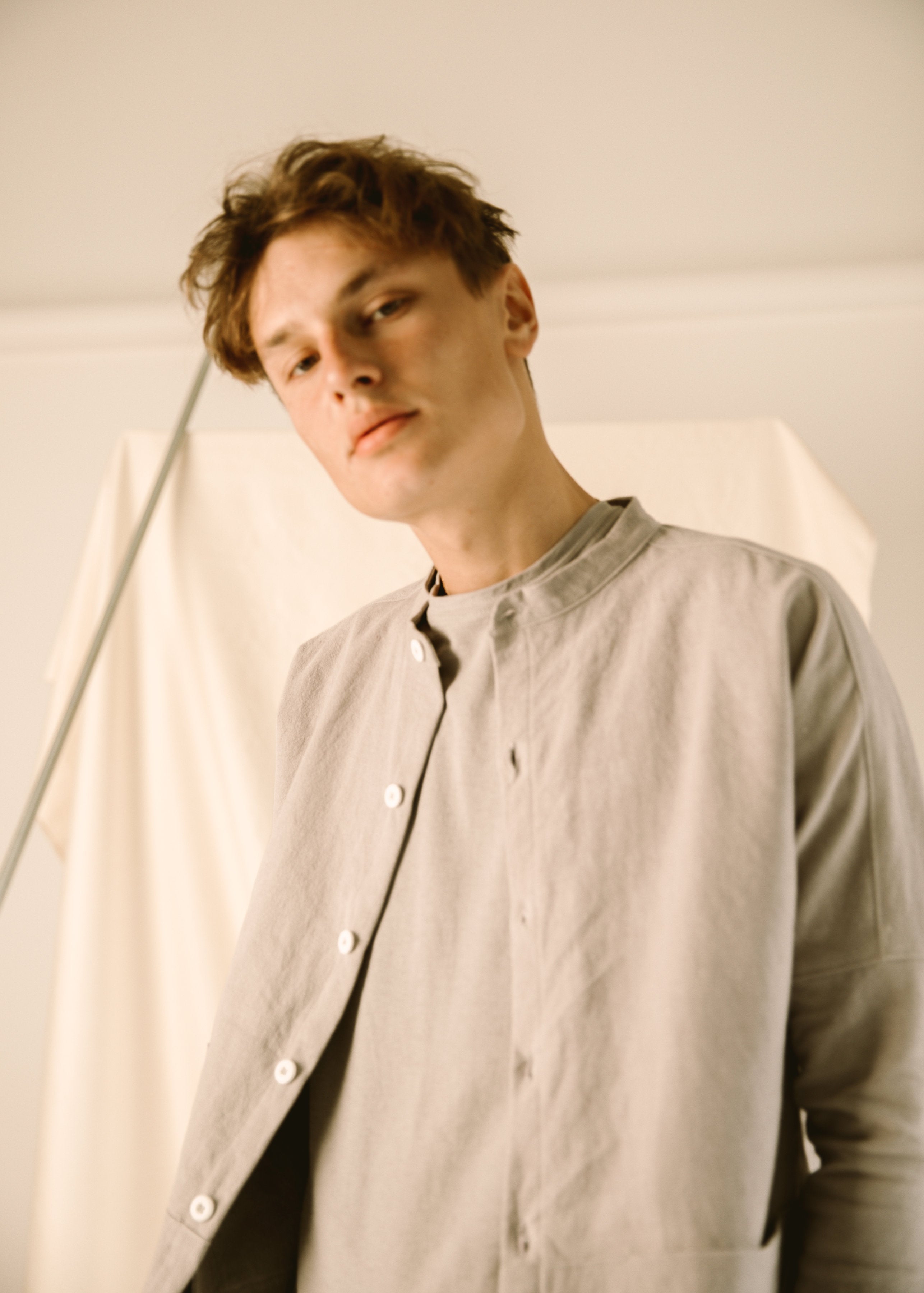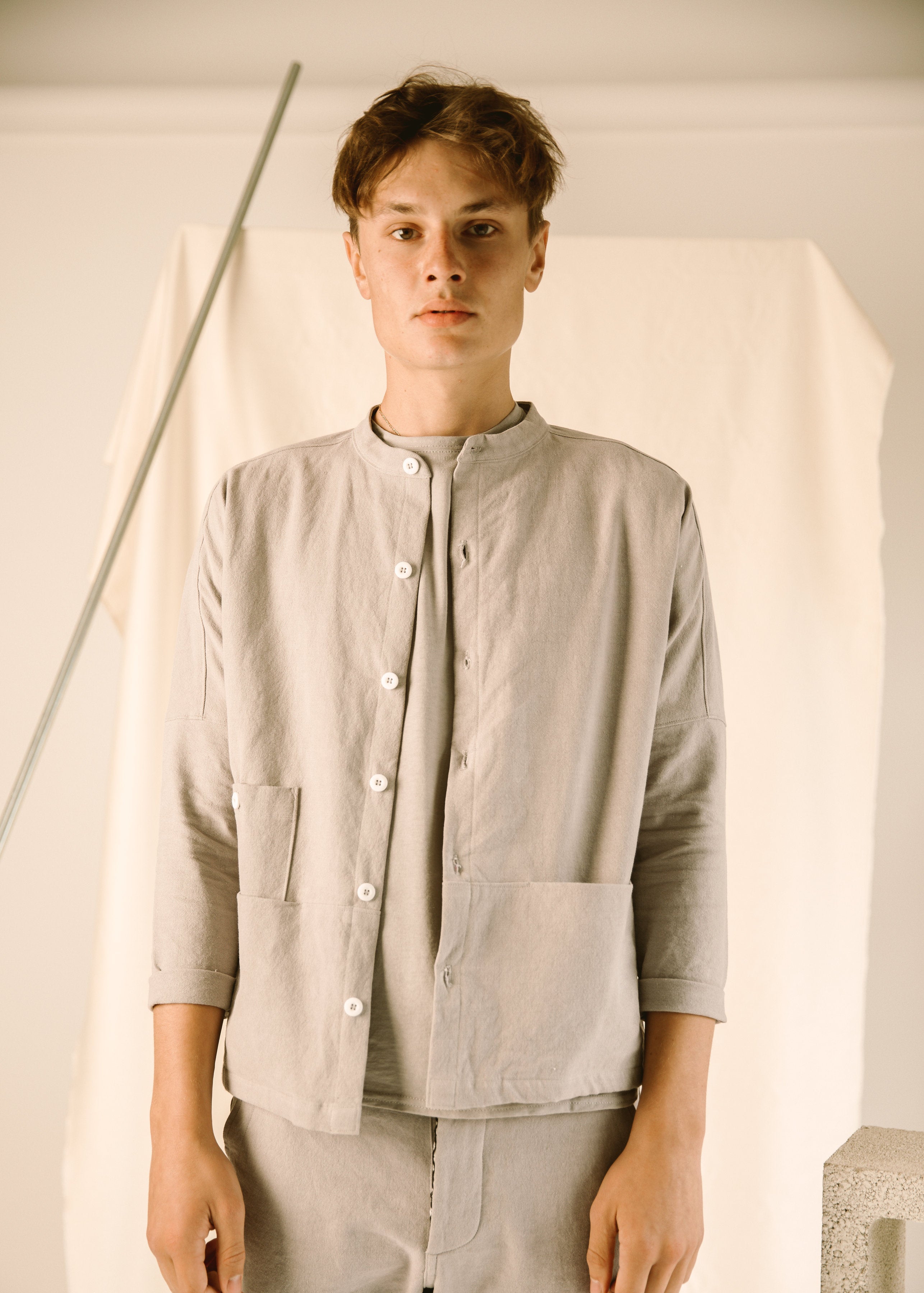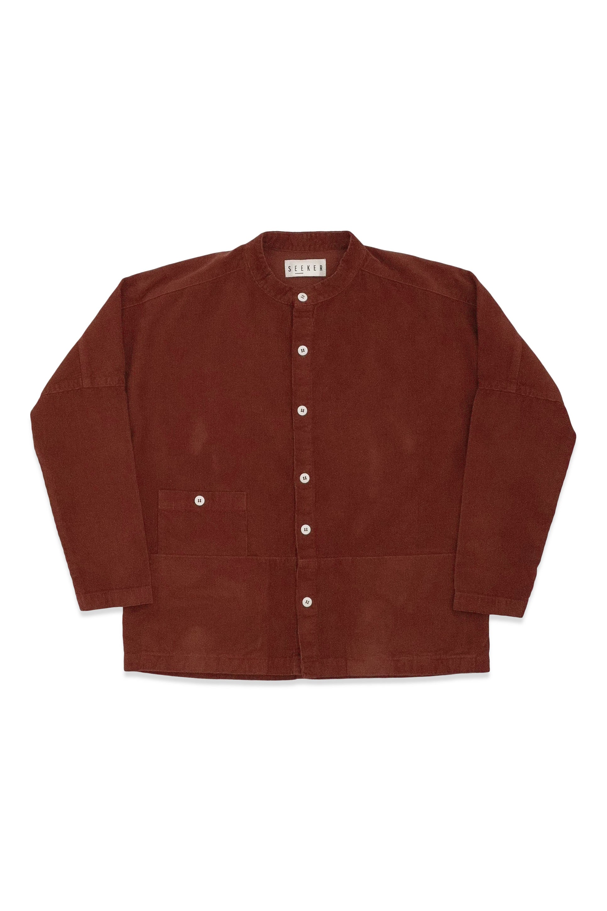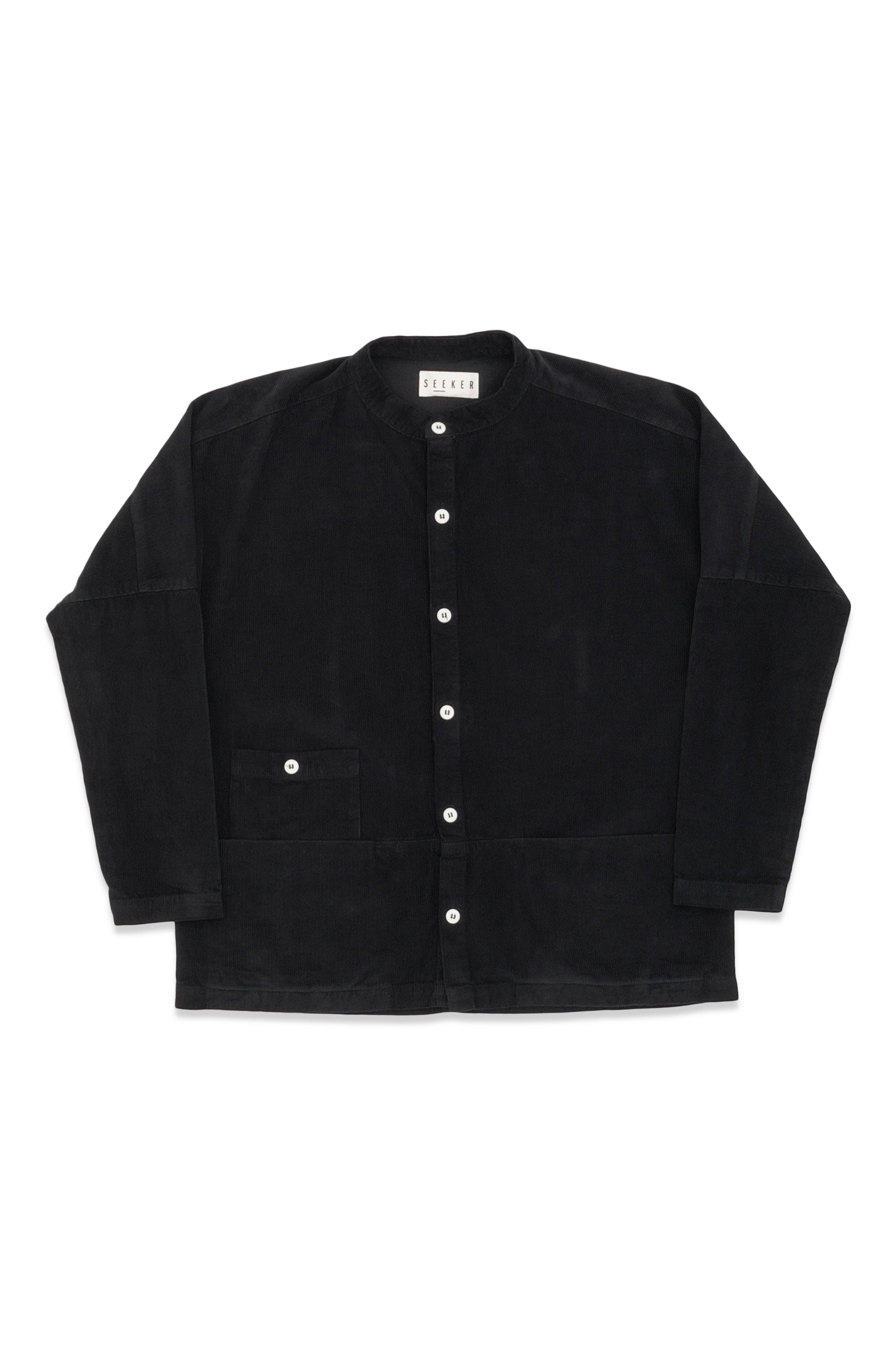 Unisex Natural cotton corduroy Chore coat with a dolman shoulder, mandarin collar, and waist pockets.