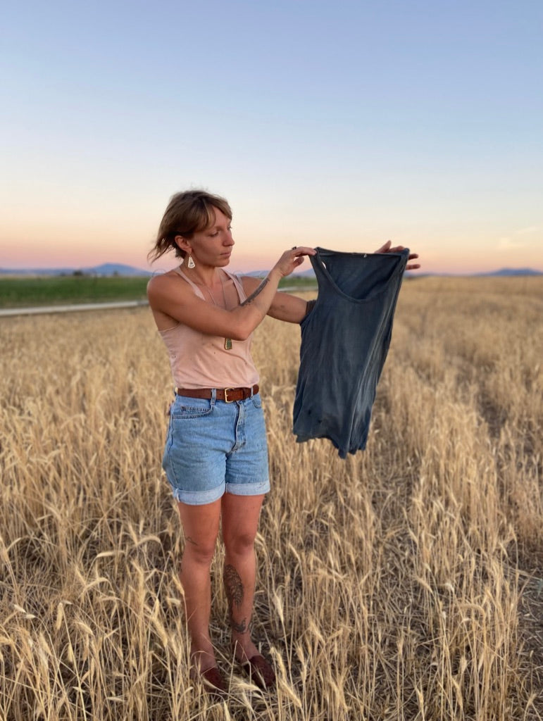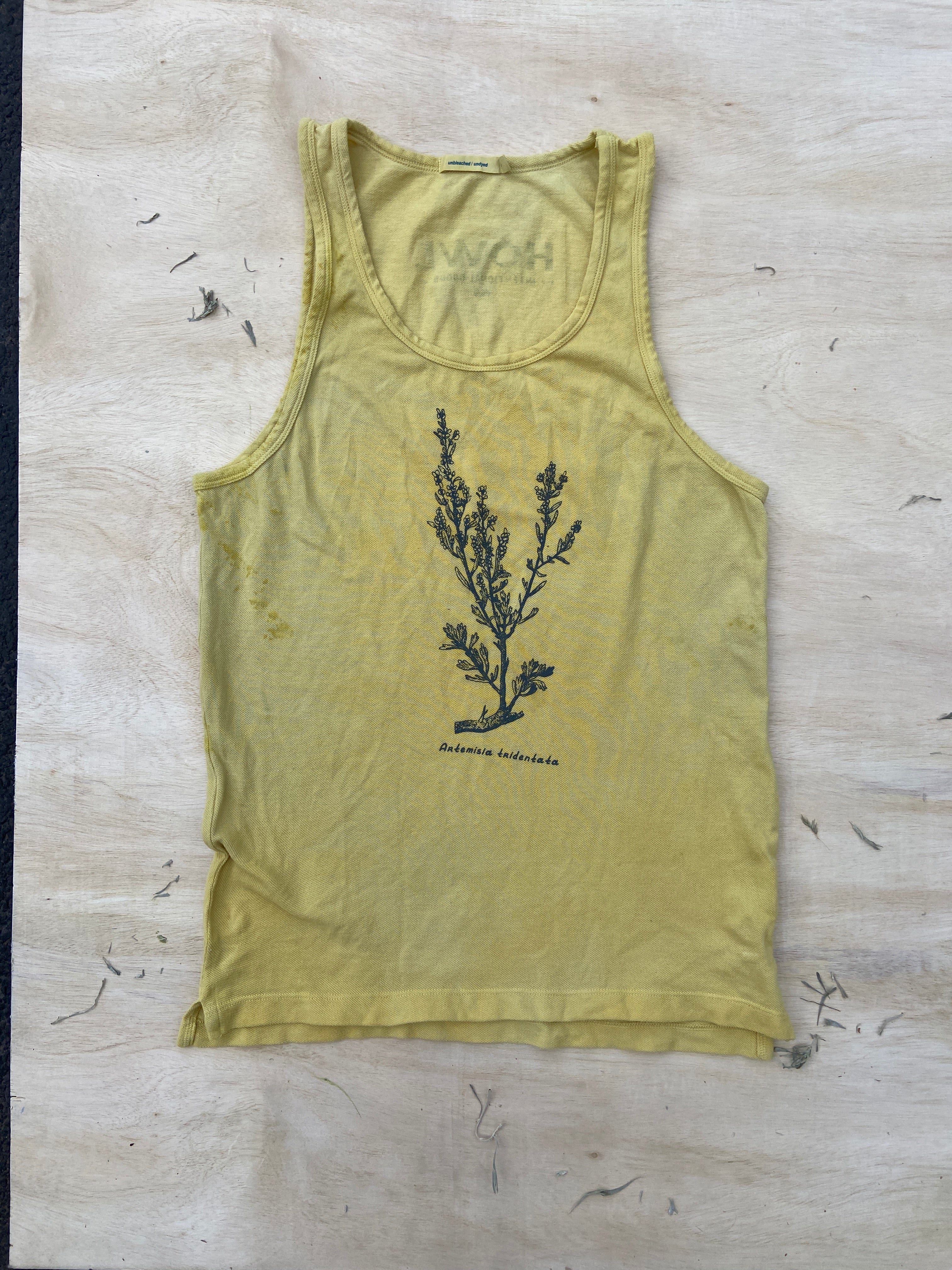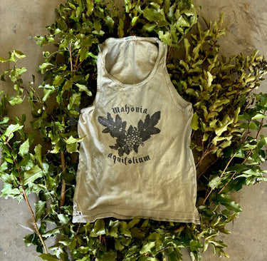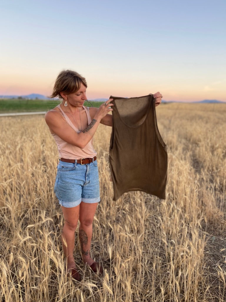 Each shirt is naturally dyed using local plants and sustainable harvesting methods and printed in Bend Oregon on Industry of All Nations natural unbleached cotton tanks.