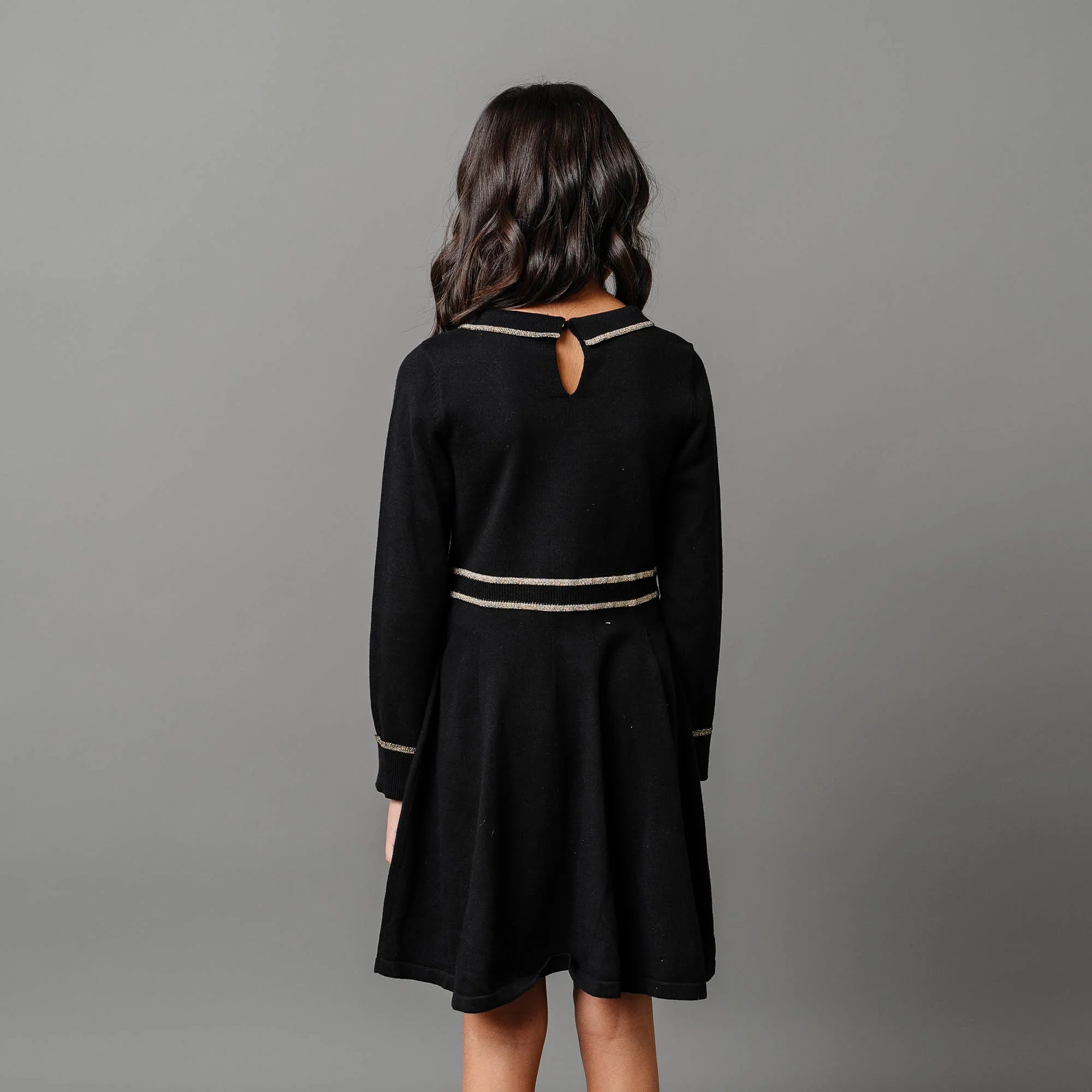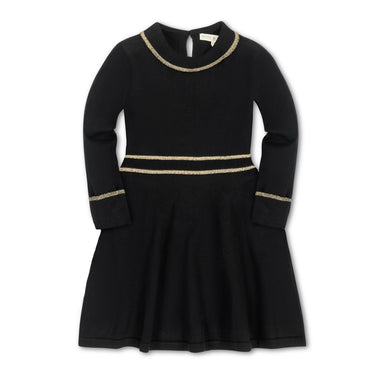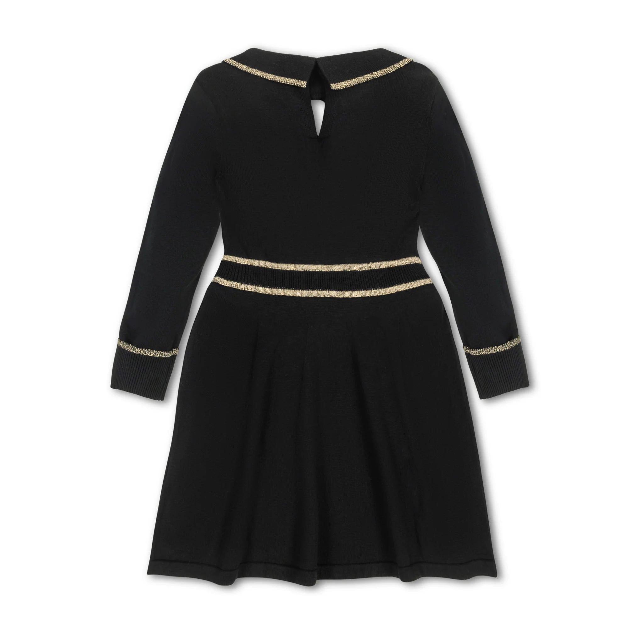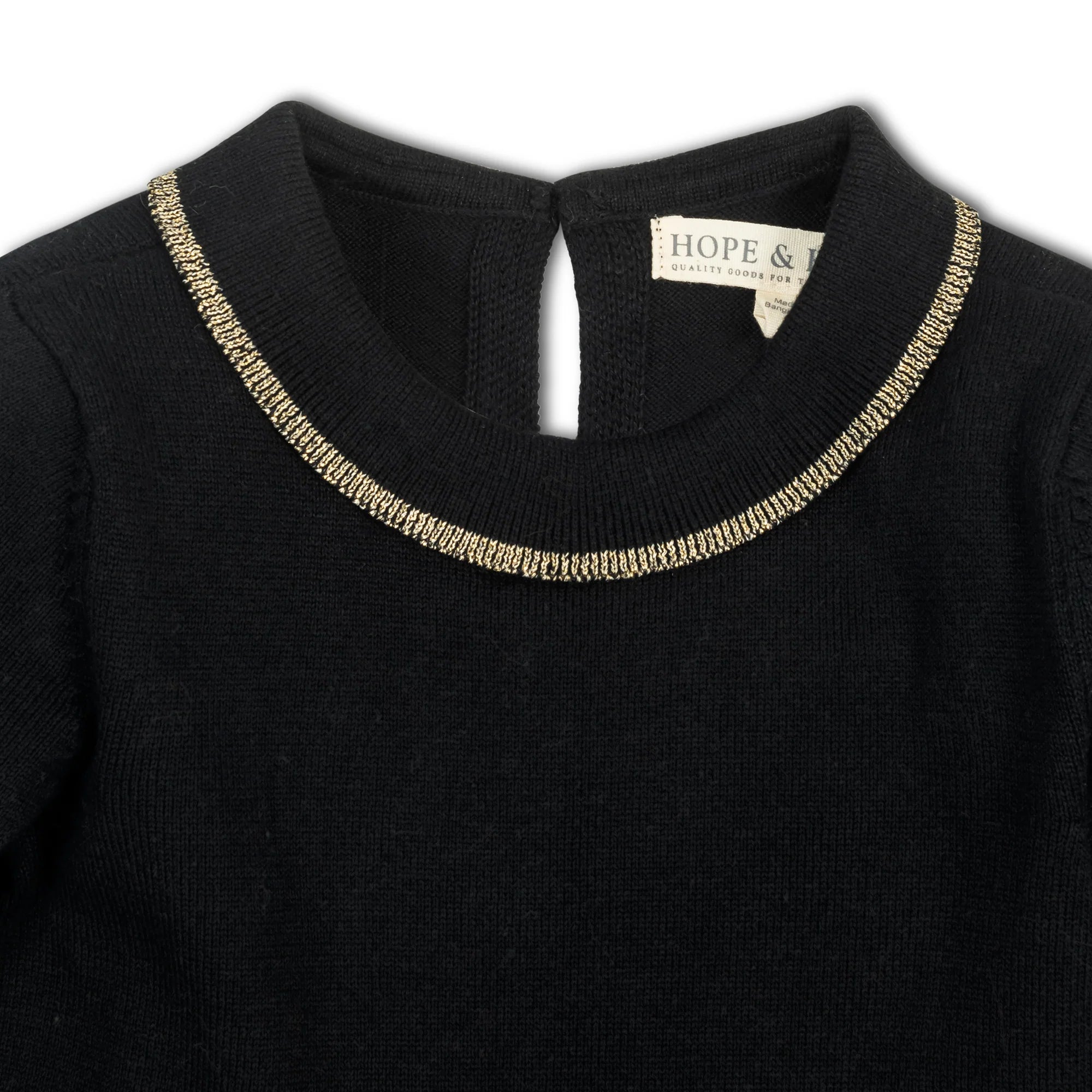 Crafted from soft organic cotton, this sophisticated sweater dress brings a touch of understated sparkle to the holiday season. Gold tipping at the ruffled collar, cuffs, and waist adds a hint of festive charm, with gold buttons at the back for easy dressing. A beautifully refined piece made for special moments and everyday joys.